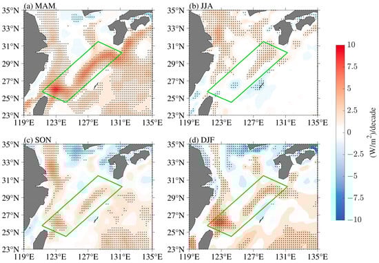 In conclusion, our study enhances our understanding of the air–sea interaction processes over the Kuroshio region and provides valuable insights into the response of these processes to global warming. Our findings underscore the importance of considering seasonal variations when analyzing long-term trends in air–sea heat exchange and have implications for regional climate research and projections.