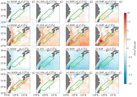 To achieve a better understanding of the LHF trend, we apply the COARE 3.5 algorithm to quantitively identify which bulk variables (Equations (1)–(3)) determine this trend. Figure 3 illustrates the spatial distribution of linear trend of each term in Equation (3), which can quantify the contributions from , , , and to the total surface LHF trend, respectively. It is evident that has a relatively smaller impact (Figure 3a–d), compared to (Figure 3m–p). In addition, air–sea-specific humidity differences () in Figure 3m–p exhibit a remarkably similar spatial structure and magnitude to Figure 2a–d. This suggests that the long-term trend of LHF is predominantly influenced by fluctuations in local air–sea humidity differences rather than local wind speed. Furthermore, in Figure 3e–h show a significant positive trend, indicating its positive contribution to local LHF. The changes in the near sea surface air humidity in Figure 3i–l display a negative trend and play a decreasing role in LHF. More quantitatively, we calculate the area average value of each term in Equation (3) in the ECSKR, as shown in Figure 4. Indeed, the sea surface air humidity change presents a large positive value, while has a negative value. This reveals that () promotes (suppresses) the release of latent heat.