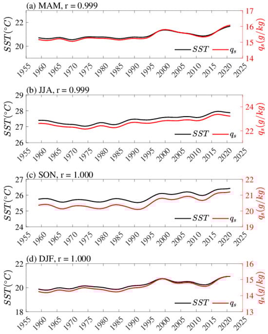 Another crucial aspect of the LHF trends over the ECSKR is their seasonal variations. Figure 3 and Figure 4 clearly illustrate that the highest LHF trend in spring is due to the low negative contribution of compared to the other three seasons, despite the positive contribution from being relatively lower than that of the other seasons. In this situation, the variations in sea surface air humidity contribute to those () of the air–sea-specific humidity difference (Figure 4), which yields the seasonal difference.