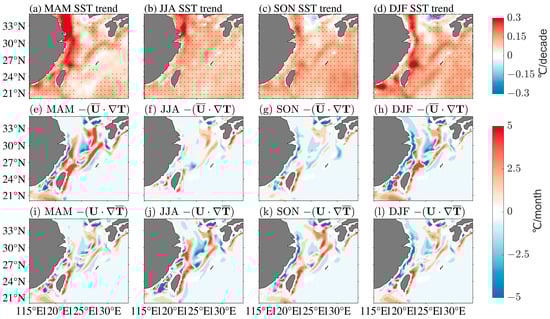 To further demonstrate the rise in SST, we plot the spatial structure of the SST trend in Figure 6a–d. The SST has a significant increase in winter and spring in the ECSKR and nearshore area, while the increase is relatively weak in summer and autumn, which appears to be consistent with the trend of LHF (Figure 2). This again confirms the dominant contribution of SST to the LHF trend. In fact, the significant increase in SST in the ECSKR has been acknowledged and investigated by some previous studies, in which oceanic lateral heat advection was found to play a primary role [30,47]. Furthermore, in order to clarify which advection process ( or ) is more important, we indicate their time average spatial patterns in Figure 6, where denotes the SST advection by climatological surface flow velocity, represents the advection of climatological SST by surface flow velocity. The figure shows that has a more pronounced effect in spring and winter compared to summer and autumn, whereas exhibits opposite behavior. Meanwhile, the spatial structures of the SST trend in spring and winter (summer and autumn) are similar to those of () in the ECSKR. This reflects that the SST trend in the ECSKR during spring and winter is determined by SST advection by the climatological flow velocity, while the trend in summer and autumn is caused by the climatological SST advection by flow velocity.