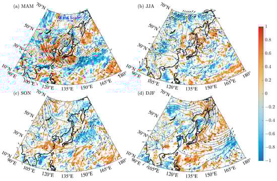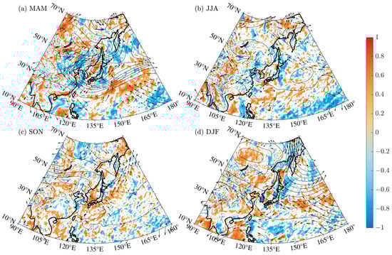 The results regarding the impact of atmospheric humidity advection on the anomaly of air–sea humidity difference in the ECSKR, as determined through regression analysis, are presented in Figure 7. In spring, a pressure decreasing trend occurs over Japan, resulting in stronger northerly winds (as seen in vectors), which transport dry and cold air from the north into the ECSKR, thereby enhancing the air–sea humidity difference. This indicates that the deepening East Asian trough (EAT) strengthens the northerly winds, resulting in more cold air from the mainland moving southward to affect LHF over ECSKR. In summer, the impact of this pressure decreasing is primarily felt in the northeastern region of Japan and greatly weakened in fall. In winter, it appears in the center of the North Pacific and has a little impact on the East China Sea. The regression findings reveal a significant influence of atmospheric humidity advection, with the most pronounced effect in spring. This is the reason for the strongest increase in the LHF trend in spring over the ECSKR.
