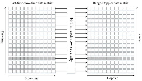 The signal processing process described above is also known as pulsed Doppler processing [20,21,22,23]. In actual pulsed Doppler processing, the set of fast-time sample series with length N obtained from each M PRIs is typically regarded as a two-dimensional fast-time–slow-time data matrix χ[n,m] within a CPI. Here, the dimension (n) where the range cells are located is termed the fast-time axis, while the dimension (m) where the number of pulses is located is termed the slow-time axis. Pulse Doppler processing involves extracting the slow-time data series per range cell from the data matrix χ[n,m] and conducting Discrete Fourier Transform (DFT) [24,25,26,27] on it. Ultimately, the fast-time–slow-time data matrix is transformed into a Range-Doppler (RD) data matrix Y[n,m], as depicted in Figure 3.