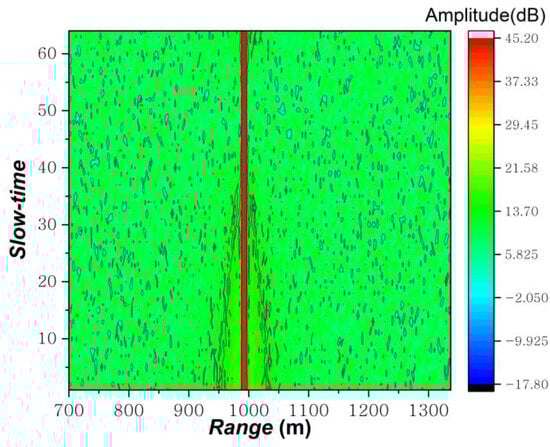 The following parameters for radar operation are configured: carrier frequency: fc = 10 GHz, wavelength: λ = 0.03 m, transmit power: Pt = 35 kW, antenna gain: G = 60, bandwidth: B = 60 MHz, pulse width: Tp = 2 × 10−4 s, pulse repetition interval: Tr = 1 × 10−3 s, coherent processing period: M = 64, and initial incident azimuthal angle: ϕ0 = 0°. In the hypothetical case, an ACR target with a size L = 1 m appears at the moment t = 0 at a range d0 = 1000 m from the radar, with an initial height of 100 m in the air, a horizontal rotational rate of 0.5 rad/s, a dropping velocity of 1 m/s, and an ambient wind speed of (5, 0, 0) m/s. At this point, the fast-time–slow-time data matrix is obtained by pulse compression, i.e., the fast-time pulse compression output of all pulse signals within a CPI, as illustrated in Figure 4.