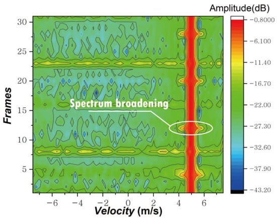 The presence of Doppler broadening is detrimental to detecting target velocity. When broadening occurs, the energy that was originally concentrated in the spectrum is dispersed, which perhaps causes false dismissal of an ACR target because the peak value of the spectrum may be lower than the detection threshold [28,29,30], as shown in Figure 7. Target false dismissal will destabilize target tracking and perplex later data analysis. Therefore, the Doppler broadening phenomenon should be minimized or avoided as far as possible.