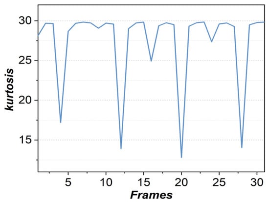 Kurtosis (K) is a measure of fat tails for the probability density distribution of the spectrum. A higher K value, which represents a sharper Doppler spectrum shape, is more conducive to speed detection. In contrast, a lower K value means that the Doppler broadening is more severe. In Figure 8, the kurtosis (K) varies with time-sequential frames. As one can see, the kurtosis is generally high in whole frames, while there is significant attenuation at a few moments, such as frames 4, 12, 20, and 28. The appearances of these kurtosis valleys exactly corresponds to the moments of Doppler broadening in Figure 6, which proves the rationality of employing kurtosis to measure the severity of Doppler broadening.