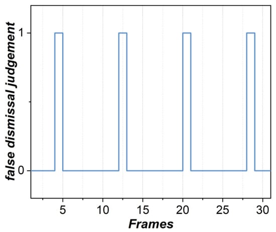 It can be seen that there is a false dismissal of the target at frames 4, 12, 20, and 28, respectively, which exactly corresponds to the moments when the Doppler broadening occurs in Figure 6. By summing Q[m], it can be concluded that the total times of false dismissal is four, which is consistent with the occurrence of Doppler broadening illustrated in Figure 6, proving the rationality of employing the number of false dismissals to measure the frequency of Doppler broadening.