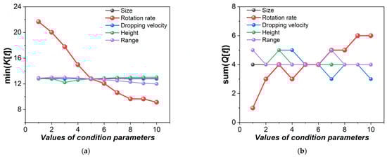 Continuing to adopt the simulation parameter settings mentioned in Figure 4, a therein single parameter would be transformed in turn by one value selected from Table 1 for each experiment. A total of 50 experiments were conducted to obtain 50 sets of time-sequential Doppler spectra. Then, K[m] and Q[m] were obtained from the 50 Doppler spectra. Finally, we collected the minimum kurtosis, min(K[m]), and the false dismissal frequency, sum(Q[m]), representing the severity and frequency of the Doppler broadening phenomenon separately, as shown in Figure 10.
