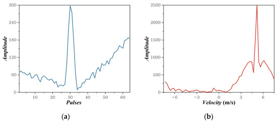 The slow-time series within the range cell where the target is situated is compressed into a spike. Furthermore, the spike’s location is consistently indicated to be at 5 m/s in the velocity dimension, aligning with the actual radial velocity magnitude. It indicates that the pulsed Doppler processing effectively extracted the velocity information of the target.