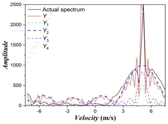The variation in the total rectangular window slow-time series spectrum (Y) in Figure 13 closely resembles that of the actual spectrum in Figure 11b. The broadening phenomenon observed in the ACR Doppler spectrum is precisely caused by the variation in the echo amplitude resulting from its spin. Analysis of the spectra of the slow-time series using four sub-rectangular window functions (Y1, Y2, Y3, and Y4) indicates that the broadening of the spectra is primarily related to the rectangular window A2. The higher amplitude of the rectangular window (A2) and its narrower width accentuate the flat trend of the asinc function in the spectrum.