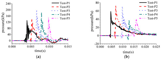The slamming values for wedges with different angles can be seen in Figure 9, which shows the slamming-pressure curve of a wedge falling from a height of 0.4 m. As can be seen from the graph, at an angle of 10°, the wedge (Figure 9a) had the highest slamming pressure when the slamming first occurred, with a large slamming pressure at the first measurement point on the wedge. Figure 9b shows a similar trend to that of the 10° wedge in terms of peak slamming pressure at measurement point P4 with an angle of 20, which also increased and then decreased. This is due to the fact that when the wedge dropped into the water, the bottom plate of wedges (10° and 20°) affected the water, so when the liquid level was continuously lifted, the free liquid surface was subjected to increasing squeezing pressure from the bottom plate, and therefore the slamming pressure also increased at this time. Once the free liquid surface rose to a certain height, wave breaking and peak of the slamming pressure appeared. This was followed by a gradual reduction in the slamming, which was caused by the separation of the wedge surface from the free liquid surface. And with the increase in the angle of the wedge, the rise in the free liquid surface was not affected too much by the base plate.