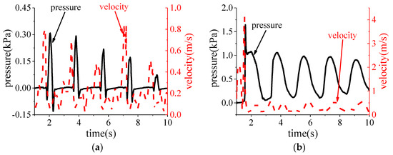 Figure 13 depicts the variation curve of the maximum pressure peak of the wedge with increasing bottom inclination angles while keeping the plate thickness (b = 5 mm), elastic modulus (E = 2.1 × 1011 Pa), and water entry velocity (v = 10 m/s) constant. From the figure, it can be observed that as the bottom inclination angle increased, the maximum pressure value on the wedge gradually decreased. This is because increasing the bottom inclination angle reduced the obstruction to water entry for the structure, leading to a decrease in the slamming pressure experienced by the structure.