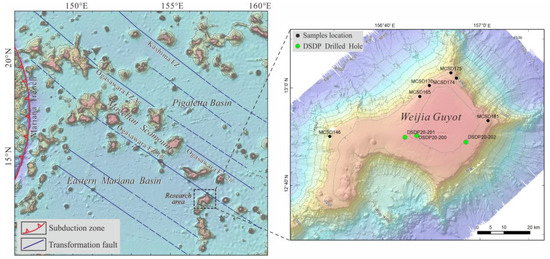 The study area is located in Weijia Guyot, a feature of the Magellan Seamount Trail located in the Western Pacific Ocean (Figure 1). The Western Pacific Ocean is a region with a high concentration of seamounts due to its age and complex tectonic history. The formation of Weijia Guyot occurred between about 118 My and 120 My [23], which is associated with hotspot activity in the South Pacific Isotope and Thermal Anomalies Area (SOPITA) of the French Polynesian islands during the Cretaceous period [24,25,26]. Weijia Guyot is approximately 150 km long and has an irregular shape with an overall NE orientation, typical of a summit platform. The water depth at the edge of the platform ranges from 1600 m to 2200 m and reaches 5500 m at its base.