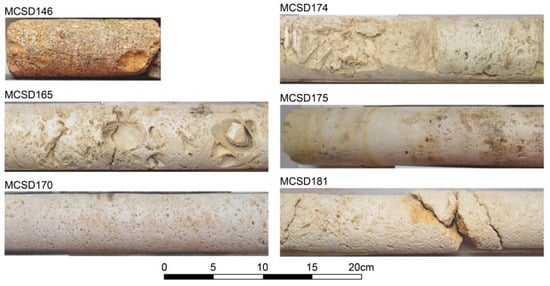 Carbonate rock samples (Figure 2) were obtained by deep-sea shallow drilling at the edge of the platform or the slope of Weijia Guyot. The length of the cores ranges from 62 cm to 102 cm. These stations, including MCSD165, MCSD170, and MCSD181, are located at the edge of the mountaintop platform with water depths ranging from 1594 m to 1630 m. MCSD174 and MCSD175 are located on a sloping platform with relatively flat terrain with water depths ranging from 1985 m to 2029 m. MCSD146 is located on steep slope areas with a water depth ranging from 2343 m to 2937 m (Figure 1).