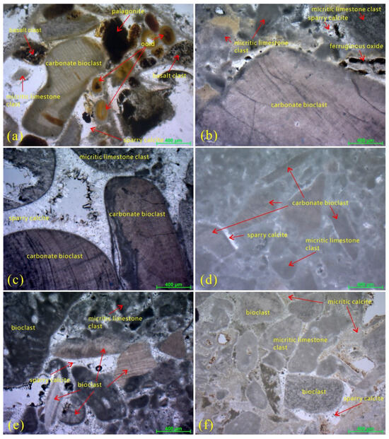 Based on field descriptions and microscopic analyses (Figure 3), carbonate rock grains mainly consist of carbonate bioclasts and coral reef clasts formed in a reef environment. MCSD146 is a carbonate intraclast sandstone with a yellow color and high porosity. The rock grains consist of carbonate bioclasts, basalt clasts, palagonite clasts, and ooids, with bioclasts dominating. Basalt clasts, palagonite clasts, and ooids are dispersed in strips, with sparry calcite cementing the grains. MCSD165, MCSD170, MCSD174, MCSD175, and MCSD181 are mineralogically similar, being pure white with a slight yellowish tinge. They are porous and consist mainly of carbonate bioclasts with some micritic limestone clasts. The cement is predominantly micritic, with some sparry calcite present.