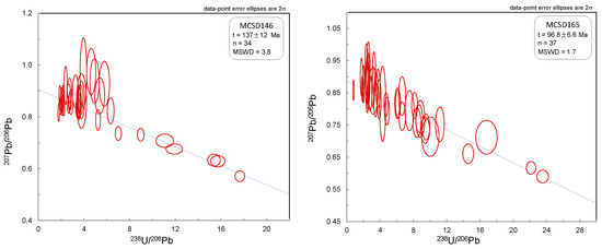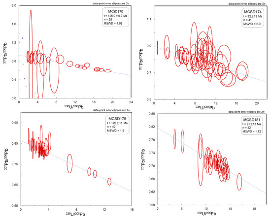 The Tera–Wasserburg concordia results (Figure 4) indicate that sample ages can be divided into two ranges: 91–96.8 My (MCSD165, MCSD174, and MCSD181) and 120–137 My (MCSD146, MCSD170, and MCSD175), suggesting that shallow-water carbonate rocks in the Weijia Guyot accumulated during two distinct events in the Early and Late Cretaceous periods respectively, with a hiatus of approximately 20 My.