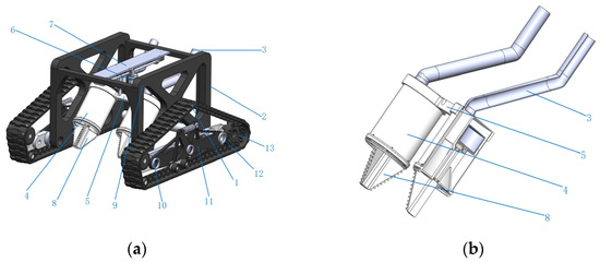 In the figure, 1—tracked chassis, 2—main frame, 3—mud pump pipe, 4—reamer device, 5—reamer connecting ring, 6—motorized actuator, 7—screw slide, 8—reamer, 9—sonar sensor, 10—front axle of the tracked chassis, 11—cushioning connecting member of the tracked chassis, 12—rear axle of the tracked chassis, and 13—motor of the tracked chassis. (a) Schematic diagram of the structure of the suction dredging robot. (b) Schematic diagram of the structure of the winch suction device.