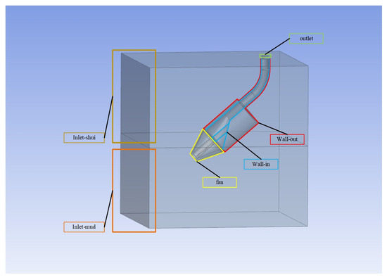 The fluid domain is established as a 1 m square, with boundaries dividing it into water and silt regions above and below, respectively. The inlet boundaries for water and silt are defined as Inlet-shui and Inlet-mud, respectively, which are positioned around the four surfaces. A sliding mesh rotating domain, designated as a fan, is configured with three surfaces as interface surfaces. The internal wall of the winch suction device is labelled Wall-in, while the shell of the device is termed Wall-out. The outlet of the water surface pipe is defined as the outlet, with all other faces set as default walls, as shown in Figure 3: