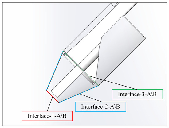 Considering computational efficiency and convergence concerns, the mixture model is selected for the fluid simulation in this paper, ensuring a balance between accuracy and computational cost. In the fluid domain model of the winch suction device, the rotating domain fan necessitates rotation. Consequently, the boundary conditions of the rotating domain fan profoundly impact the stability of the data transmission between the rotating domain fan and the surrounding fixed fluid domain. As depicted in Figure 5, the three surfaces of the rotating domain fan are configured to form intersection interfaces with the surrounding fixed fluid domain. These interfaces are denoted as interface-1-A\B, interface-2-A\B, and interface-3-A\B, where face A represents the face of the rotating domain fan, and face B represents the face of the surrounding fixed domain.