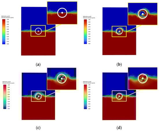 Volume of sludge at different moments of reamer speed 120 rpm. (a) Silt distribution in the initial moment. (b) Silt distribution at the 0.25 s moment. (c) Silt distribution at 0.5 s moment. (d) Silt at 0.75 s moment, respectively.