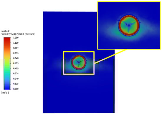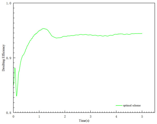 Based on the results of the orthogonal test design and without considering interactions, the optimal program is determined by selecting the maximum K value corresponding to each factor’s level, denoted as . This translates to setting the rotational speed to 120 rpm, the angle of the winch suction device arrangement to 35°, the water flow rate to 1.05 m/s, the inlet diameter to 168 mm, and the outlet diameter of the pipe to 56 mm. As mentioned earlier, when setting up the initial simulation experiment, the settings are as follows: reamer rotation speed of 60 rpm, reamer arrangement angle of 45°, pump pipe outlet water velocity of 1.3 m/s, connecting silo pipe diameter of 168 mm, outlet pipe diameter of 56 mm, through the simulation test, the dredging efficiency of about 0.83538. The parameter settings with the results of the optimal solution determined by orthogonal test have a big difference! At the same time, comparing Table 5, it can be found that there is no optimal programme group in the 25 groups of the orthogonal test, so the optimal programme determined by the experimental results has not been verified by simulation; in order to maintain scientific rigor, it is necessary to verify whether the optimal results of the orthogonal test are better than the other results of the test, so the optimal programme is set up for the simulation, and the result is shown in Figure 12.
