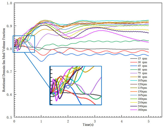 Determining the optimal rotational speed is crucial for achieving stable and efficient desilting operations. To determine this, a range of rotational speeds was tested incrementally with a gradient of 15 rpm. The interval between rotational speeds is determined based on changes in the silt volume fraction observed in simulation tests. The results of these tests are illustrated in Figure 8.