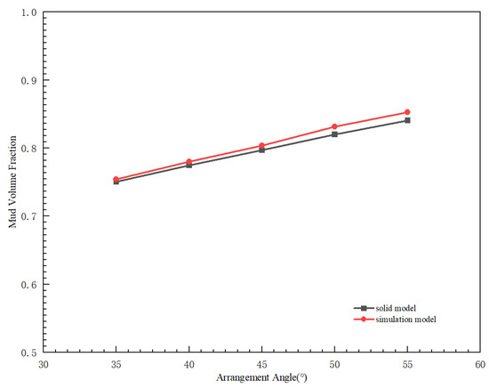 To explore this further, various arrangement angles are tested with a gradient of 5°. The arrangement angle of the reamer is then determined based on the changes in the volume fraction of silt. The results of these experiments are illustrated in Figure 10.