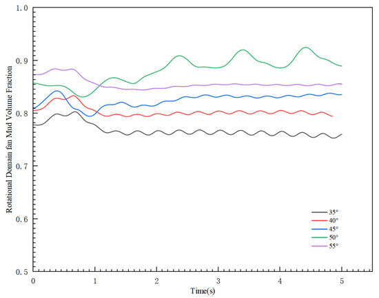 In Figure 10, the silt volume fraction at the onset of the simulation varies across different arrangement angles of the winch suction device, which is consistent with the outcomes of the solid model. The curves exhibit a pattern of initial increase followed by a decrease for arrangement angles of 35°, 40°, 45°, and 55°, ultimately stabilizing. Conversely, when the arrangement angle is 50°, the curve initially decreases, then increases, and eventually stabilizes, albeit with indications of fluctuation.