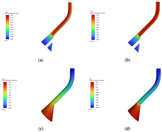 Velocity and pressure maps of the pipe for different water velocities. (a) Velocity distribution of water velocity 0.7 m/s. (b) Velocity distribution of water velocity 2.1 m/s. (c) Pressure distribution for water velocity 0.7 m/s. (d) Pressure distribution for water velocity 2.1 m/s.