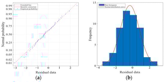 Distribution of the residual data after normalization. (a) Normal probability diagram; (b) frequency distribution histogram.
