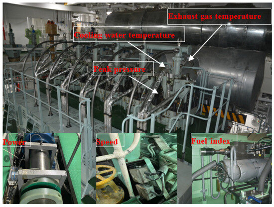 This section is devoted to describing how the proposed adaptive threshold method was demonstrated with real ship data. The data selected in this paper mainly come from the state parameters of the ship’s main propulsion diesel engine (as shown in Figure 4) and some relevant data come from the auxiliary system. For the state parameters of the MSAE, it was not necessary to adopt an adaptive threshold for all of the parameters. According to the characteristics of a real ship, parameters that could easily be affected by environmental temperatures, loads, and sea state changes were selected for the adaptive threshold calculation. These parameters were important indexes for evaluating the states of the MSAE.
