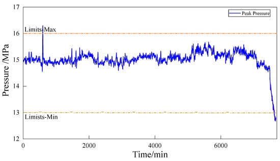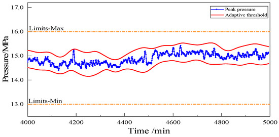 A section of the stable operation data was selected from the peak pressure data to test the effect of the adaptive threshold method in normal operation. As shown in Figure 12, the data from 4000 min to 5000 min were selected for analysis. It can be seen from the figure that the data were stably distributed between the upper and lower bounds of the threshold, the threshold bandwidth was narrow, the entire process is stable, and the upper and lower bounds were far from the limit value. If the limit value was selected as the reference for the alarm and state evaluation, early failures were not easy to detect.