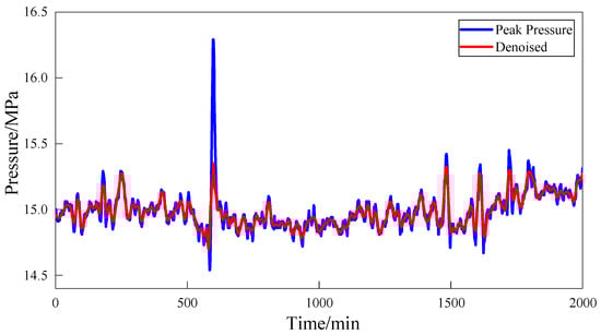 The KNN and isolation forest algorithms were used to process the raw data. Figure 6 shows part of the time-series data for the peak pressure before and after the data processing. The denoised data are smoothed, following the trend of the raw data.