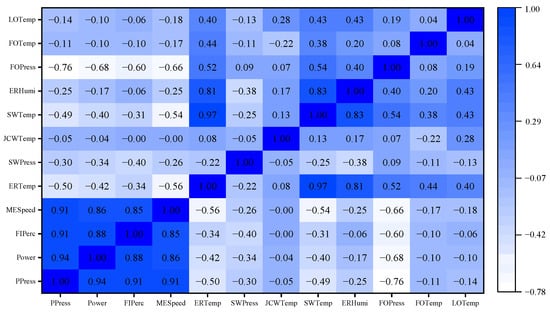 The Pearson correlation coefficient could be used to calculate the strength and direction of the correlation of parameters, thus reducing the complexity and computing time of the model [28]. According to this method, the absolute value of two signal correlation coefficients is between 0.3 and 0.5, which indicates that they have a certain correlation. If the absolute value is between 0.5 and 0.8, it indicates that there is a moderate correlation between signals. If the value is greater than 0.8, it indicates that there is a strong correlation between signals [29]. It can be considered that when the absolute value is greater than 0.5, one signal can more accurately reflect the change in another signal.