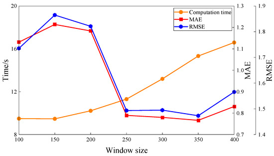 Step 4: With the gradual increase in the window size, the time cost of the model is increasing, but the MAE and RMSE are decreasing. As a trade-off, the most appropriate window size is about 250. Usually, and should be distributed on both sides of this value. Therefore, set to 200 and set to 300 are the best choice.