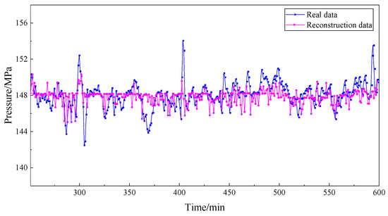 According to the characteristics of the peak pressure, the initial window size was determined by Equation (16). The sliding step size was selected as (rounded). The samples were used as the initial training set to reconstruct the peak pressure. The training data are updated (the number of updated data were equal to the step size), and the window and step size were recalculated. Therefore, the continuous reconstruction of the peak pressure data from to end was realized. Comparing the reconstructed values with the measured parameters, the reconstruction effect of a section of data is shown in Figure 11.
