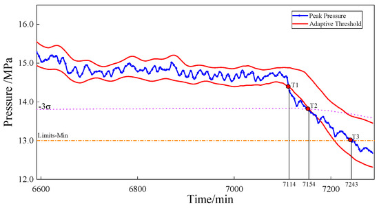 A segment of abnormal data was selected from the peak pressure data to verify the adaptive threshold. As shown in Figure 13, the data from 6600 min to 7300 min were selected for analysis. These are the data of the abnormal peak pressure reduction caused by the fuel injector failure. It can be seen from the figure that T1, T2, and T3 indicate that the measurement parameter exceeded the adaptive threshold, , and the limit value, respectively. When there is a real fault, and the function of the system and equipment decreases significantly, an alarm will appear, which is an early warning. If the adaptive threshold was used as the alarm threshold, the early warning of a fault was achieved. In this way, enough time was spent on decision-making to prevent catastrophic accidents.