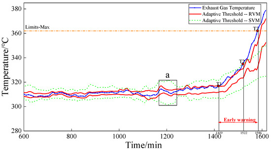Figure 14 illustrates the comparison between the adaptive threshold obtained using the RVM and SVM methods [25]. The exhaust gas temperature was applied to validate both the performances of the two approaches. From Figure 14, it is evident that the proposed strategy shows a more compact bandwidth, and meanwhile, the adaptive threshold obtained has better local adaptability, as shown in the area a. Both approaches can realize the early warning (167 min and 46 min) of the exhaust gas temperature (compared with the general limit value alarm method, the alarm time is T3). However, the threshold obtained by the RVM method is more sensitive to the data change trend, so it will trigger earlier fault warnings, as shown in T1. The parameters cross the threshold obtained by the SVM method at T2 and lag significantly. Therefore, the proposed adaptive threshold as the early warning threshold will have enough time to make appropriate decisions.