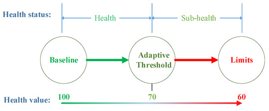 The deviation state evaluation method used the degree of deviation in the state parameters from the baseline and the threshold as the standard to measure the size of the health factors. As shown in Figure 15, the baseline was the optimal operation state for various operating conditions [33]. The area between the upper and lower bounds of the adaptive threshold was the most likely distribution area of the data. The area between the threshold and the limit value indicated that the data deviated from the main trend. Generally, an early warning had to be given to prevent further deterioration of the performance and a transition to a failure state. The baseline-adaptive threshold limits divided the equipment status into two levels: health status and subhealth status. If the real-time measurement parameter was between the baseline and the adaptive threshold, the equipment was in a healthy state, and the parameter value was calibrated for the deviation state of the threshold and the baseline to obtain the corresponding health value. If the parameter was between the threshold and the limits, it indicated that the equipment was in a sub-healthy state. This may have been due to degradation, condition changes, and other factors leading to performance changes. Combined with the remaining useful life (RUL) prediction algorithm, the health state prediction could be achieved.