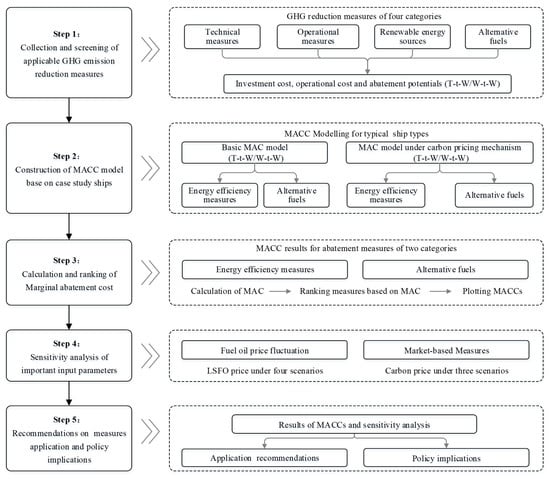 Summarizing the previous literature in this field, although extensive studies have developed MACC models to investigate the cost-effectiveness and abatement potentials of representative greenhouse gas emission reduction measures, there are still some gaps and limitations in terms of abatement measures, GHG emission assessment methods, and market-based measure implications. Firstly, there is limited research focusing on both energy efficiency measures and alternative fuels. Currently, applying energy efficiency technologies will not be enough to meet the increasingly stringent emission reduction targets, and thus, the development trend is toward the integrated application of alternative fuels and energy efficiency measures to achieve a greater emission reduction potential [33]. Secondly, the international regulatory system for assessing greenhouse gas emissions from marine fuels is shifting from a vessel-based approach to a lifecycle approach. The MACC of marine alternative fuels calculated following the vessel-based approach will be no longer applicable to the upcoming lifecycle assessment method [34]. Thirdly, previous MACC studies did not adequately account for the influence of market mechanisms. The EU has currently introduced a package of market-based mechanisms to the shipping industry, including the Emissions Trading System (ETS) and FuelEU Maritime. At the IMO level, the carbon pricing mechanism linked to marine fuel GHG intensity is also under discussion. Therefore, it is necessary to investigate the impact of carbon pricing mechanism on the cost-effective performance of emission reduction measures.