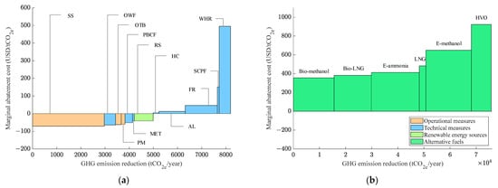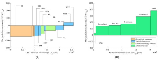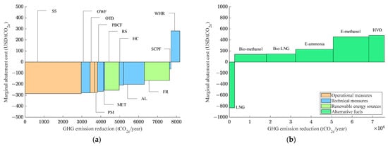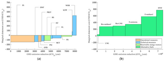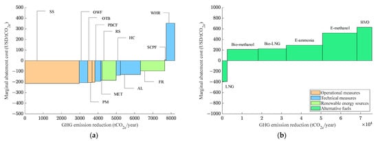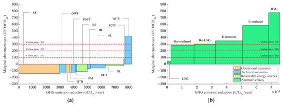 In response to the increasingly stringent greenhouse gas emission reduction targets, the industry is actively developing and applying emission reduction measures, including technical energy efficiency measures, operational energy efficiency measures, and low-carbon/zero-carbon alternative fuels [2]. In policy formulation and investment decisions concerning greenhouse gas reduction measures, the emissions reduction potential and the implementation cost are two crucial considerations [3]. The industry seeks to prioritize measures with high emissions reduction potential and low cost implications, but in practice, these two factors are often challenging to balance. In other words, measures with a high emissions reduction potential often involve significant costs, while those with low implementation costs typically offer a limited emissions reduction potential. Therefore, policy makers and investment decision makers are confronted with the challenge of selecting suitable and cost-effective carbon reduction measures [4,5,6]. To this end, marginal abatement costs (MACs) and marginal abatement cost curves (MACCs) have been widely used to assess the cost-effectiveness of various greenhouse gas emission reduction measures for ships [7,8,9]. The marginal abatement cost refers to the cost of reducing one additional unit of emission. Based on the relationship between marginal abatement cost and emission reduction potential, MACC can be plotted [10,11]. With MACC to represent the economic feasibility of various emission reduction measures, it is possible to rank all the measures according to their cost-effectiveness and propose priority measures for implementation. The MACC method has become an effective analytical tool providing support for policy formulation and investment decisions [12,13,14].