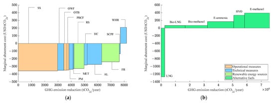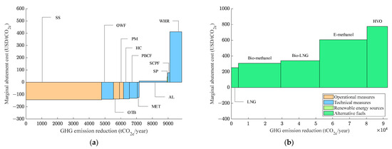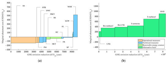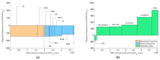 MACC results for bulk carriers (LSFO price increase 50%). (a) Energy efficiency measures. (b) Alternative fuels.