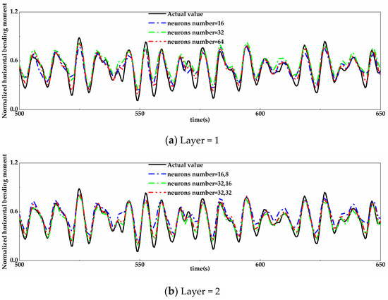 For the horizontal bending moment (HBM) prediction model, a single-layer neural network with 64 neurons using the ‘adam’ optimizer is employed. The GRU network model exhibits the highest prediction accuracy, followed by the BI-GRU network model, while the prediction accuracy of the LSTM and BI-LSTM network models is slightly lower, as shown in Figure 6 and Figure 7. Among GRU networks, at a window length of 150, = 0.837 and RMSE = 0.057, demonstrating notably superior performance compared to a window length of 100, and marginally better performance compared to window lengths of 50 and 200. The window lengths of 200, 200, and 200 are the optimal window lengths for the LSTM, BI-LSTM, and BI-GRU networks, respectively.