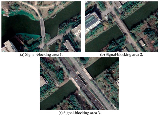 The bridge width of signal-blocking area 1 is approximately 14 m, as shown in Figure 4a. The bridge width of signal-blocking area 2 is approximately 21 m, as shown in Figure 4b. Signal-blocking area 3 consists of two bridges separated by a distance of 6 m, with each bridge having a width of roughly 25 m, resulting in a total signal blockage area across an expanse of approximately 56 m, as shown in Figure 4c.