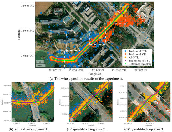 Traditional GNSS receivers use scalar-tracking loops to process satellite signals. A scalar-tracking loop is a simple feedback control system that is used to separately track the pseudocode phase error and carrier frequency error of each satellite signal. In this tracking mode, the processing of each satellite signal is independent, and there is no information exchange or fusion [1]. STL focuses only on the strength changes in individual satellite signals and maintains synchronization with the satellite signal by adjusting the frequency and phase of the local oscillator. This single-channel tracking method makes handling multiple satellite signals relatively easy. However, the drawback of STL is that it cannot analyze the signal quality deeply. It cannot distinguish between directly received satellite signals and multipath signals caused by reflections from the surrounding environment; therefore, its tracking accuracy is affected in cases of severe multipath effects or signal obstruction. Additionally, STL cannot utilize information from different channels for cross-validation or assistance, thus limiting its performance in complex environments. Researchers have proposed a new vector-tracking loop (VTL) structure to solve the signal-tracking problem in complex environments. This structure utilizes advanced technology and algorithms to accurately track signals in complex and changing environments, and it exhibits strong anti-interference capabilities [2,3]. VTL controls the joints of all tracked satellite signal channels through navigation fusion filters, thus fully utilizing the common information between each channel [4]. This feature enables the VTL to better track weak signals and highly dynamic signals without adding external hardware assistance, and it also exhibits a higher tracking performance under multipath and non-line-of-sight signal conditions [5]. Therefore, VTL is a solution to unstable signal tracking in weak-signal scenarios and has important research significance. Some scholars have made improvements to the signal-tracking loop of VTL and introduced new filtering schemes and optimized algorithms to improve the tracking accuracy of the loop for carriers and code. To reduce the impact of weak signals on the vector-tracking loop and improve navigation accuracy, Kim et al. proposed a new tracking-loop structure. They used local filtering linear filters and covariance scaling methods to mitigate the influence of weak signals on the entire system, resulting in a good signal-tracking performance [6]. To improve the stability of the vector-tracking loop, Lin et al. proposed a loop tracking structure based on a diagonal weighting matrix. The simulation shows that even though the accuracy of the navigation results is slightly lost, the system can obtain strong robustness [7]. Reducing the frequency error of signal tracking is also a way to improve system stability. Park et al. designed the loop structure of the LQG-VTL and calculated the total frequency tracking error to determine the control gain matrix in the algorithm structure. Finally, by comparing the EKF-VTL method with the simulation, the LQG-VTL method was found to have better system robustness [8]. Liu et al. proposed a vector-tracking framework based on FLS-VTL to solve the problem of the signal loop losing lock under signal occlusion by using the intermediate pseudo-range error and pseudo-range rate error in the calculation process of the software receiver as the input parameters of the navigation processor to solve the navigation results. This method improved the signal-tracking capability of the system. It also improved the navigation precision to a certain extent [9]. Xia et al. proposed a vector-tracking algorithm based on VDFLL, which has a good effect on preventing signal fluctuations caused by ionospheric scintillation, making the signal-tracking loop perform well even in the case of strong ionospheric scintillation [10]. These methods not only enhance the noise-suppression capability of the signal processing system but also strengthen the anti-interference ability of the system. In addition, they have adopted advanced digital signal-processing techniques to effectively reduce multipath interference in the signal and have demonstrated good stability and reliability in complex electromagnetic environments. These technological innovations provide reliable, stable, and efficient solutions for the practical application of VTL. However, current research on the performance of VTL methods mainly focuses on improving the anti-interference ability, stability, and robustness of the system and does not comprehensively evaluate the accuracy of the entire navigation system from signal capture and tracking and navigation results. At the same time, few studies have conducted actual motion experiments to evaluate the performance of the proposed method.