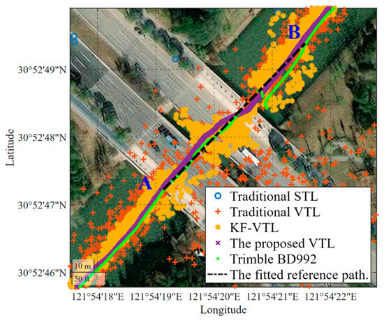 The results of the navigation experiment are shown on the map in Figure 10a. The specific location results of the occluded areas are shown in Figure 10b–d. The experiment used the positioning results of the Trimble BD992 receiver as the reference motion trajectory for the rubber boat and compared the traditional STL, traditional VTL, KF-filtered VTL, and RTS smoothing algorithm-based VTL proposed in this paper. As can be seen from the disconnected green line in Figure 10d, the Trimble BD992 receiver may fail to output navigation results when encountering long-term satellite-signal blockages. Therefore, to compare the real experimental route, the rubber boat was kept at a constant speed and straight-line motion during the experiment. The position of the blocked area is calculated by interpolating between reliable position points on both sides of the obstruction and ultimately fitting a credible reference path. The fitted reference path is shown by black lines, A-B, in Figure 11. The velocity results for the entire experiment are shown in Figure 12. The following section analyzes the navigation performance of the four loop tracking schemes in different occlusion environments.