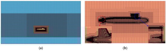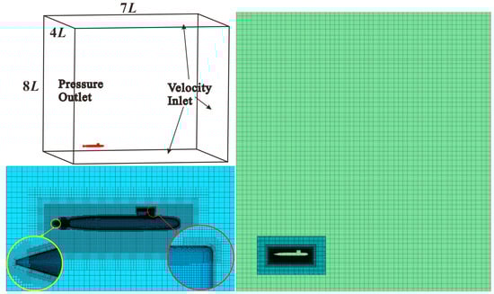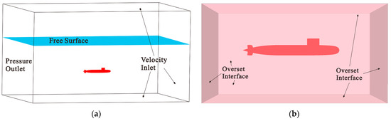 Figure 2 illustrates the boundary conditions of the computational domain. In Figure 2a, the boundary conditions of the background region are depicted. The boundary surface behind the hull is set as a fluid pressure outlet, located at a distance of 4L from the hull. All other boundary surfaces are designated as velocity inlets. The boundary surface at the front of the hull is at a distance of 4L from the hull, while the left- and right-side surfaces are each at a distance of 3L from the hull. Also, the upper and lower boundary surfaces are located at a distance of 4L and 1.5L from the hull, respectively. The submarine is positioned at a distance of 1.5L from the free liquid surface. In Figure 2b, the boundary conditions of the overset grid region are all defined as overset interfaces.