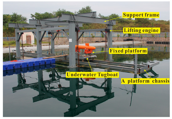 The free ascent motion test of the submarine was conducted at the outdoor water tank test site of the China Special Aircraft Research Institute. The experimental tank is 60 m long, 60 m wide, and 5.5 m deep. To facilitate the free-surface upward motion test of the submarine, a test platform was constructed within the test tank, as depicted in Figure 4. The test platform primarily consists of a platform chassis, support frame, submarine fixed platform, underwater towing carriage, lifting support, lifting watertight motor, and underwater camera system. Specific parameters of the test platform are detailed in Table 3.