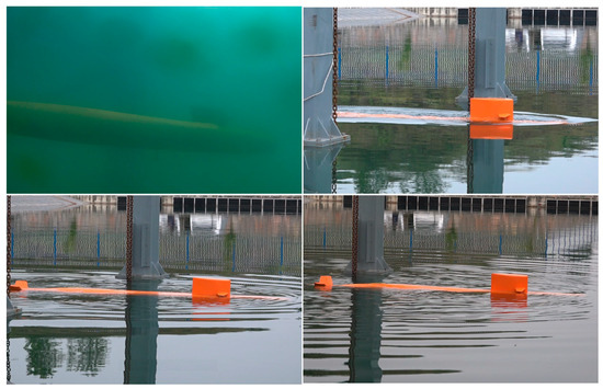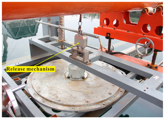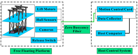 To achieve the free ascent motion of the submarine, it is necessary to install the release mechanism on the submarine’s fixed platform to detach the submarine, as shown in Figure 5. Inside the submarine, an attitude sensor is installed at the center of gravity to record the roll, pitch, and yaw angles of the submarine. A depth sensor is mounted at the bottom of the submarine to come into contact with the surrounding water, measuring changes in the depth of the submarine. In addition, three-axis acceleration sensors are installed at the front, middle, and rear positions of the submarine to measure the motion state of the submarine during the upward motion. The parameters of sensors required for testing are listed in Table 4. All sensor data are collected and stored by a data acquisition system, with a data collection frequency of 100 Hz during the experiment. The entire testing system is controlled by an onshore host computer, which transmits data and control commands via optical fiber with zero buoyancy. The flowchart of the control system for the free ascent test of the submarine is shown in Figure 6.