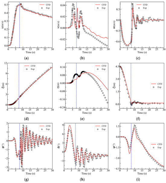 To validate the accuracy of the numerical calculations, a series of experiments were conducted for the free ascent motion of the submarine in a water tank. An overview of the test details was given in the previous sections. Figure 7 presents a comparison between the time history curves of CFD and experimental free ascent motion parameters. Figure 7a–i, respectively, illustrate the longitudinal velocity u, lateral velocity v, vertical velocity w, longitudinal displacement ξ, lateral displacement η, and vertical displacement ζ, as well as the roll angle φ, pitch angle θ, and yaw angle ψ. The blue dashed lines in the figures represent the moment when the submarine model emerges from the water.