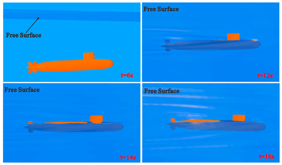 Figure 8 depicts the images captured at different time points during the free ascent test process of the submarine, illustrating the movements of the submarine both underwater and on the water surface. Also, Figure 9 displays images from various time points of the submarine ascent process obtained through CFD numerical simulation. It is evident that the postures predicted by the CFD calculations align well with the experimental observations.